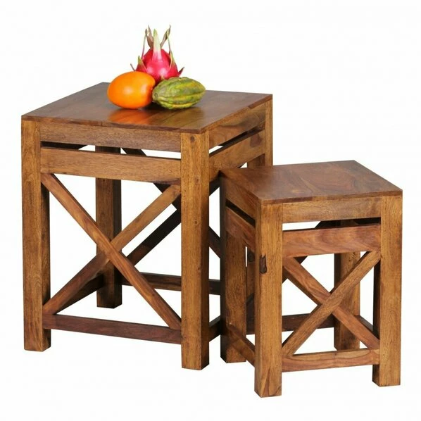 Ein tolles 2er-Set an Beistelltischen aus massivem Sheeshamholz. Das braune Holz wurde zum Schutz der Oberfläche gebeizt. So bleibt auch die natürliche Maserung erhalten und jeder Tisch ist ein echtes Unikat. Platzsparend können die Tische zusammengestellt werden.