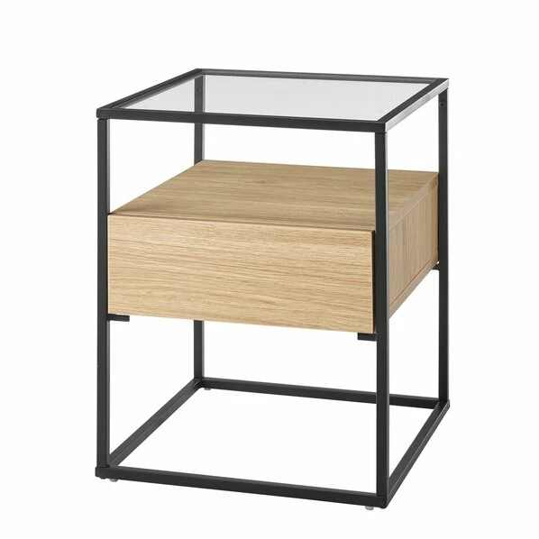 Beistelltisch – Eiche-schwarz – Glasplatte – Mit Schubkasten