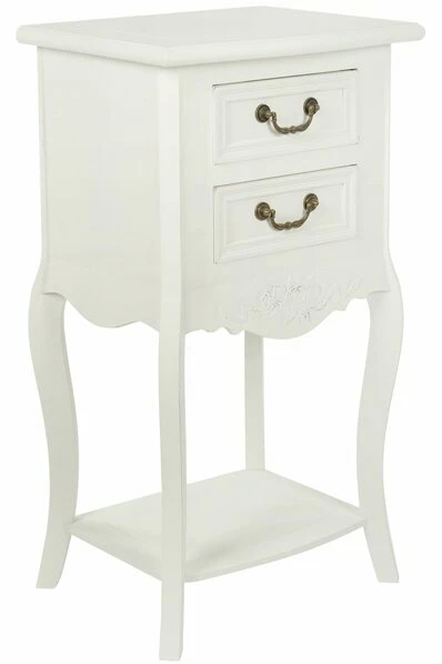Wunderschöner Beistelltisch im Shabby Chic Look. Die weiße Oberfläche ist im leichten Used Look gehalten und macht dem Namen ELEGANCE alle Ehre. Die beiden Schubkästen sind mit liebevoll verzierten Griffen aus Metall versehen. Darunter findet sich ein eingraviertes Rosenmotiv, welches von den geschwungenen Beinen eingerahmt wird.