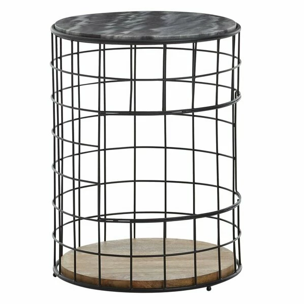 Dieser Beistelltisch ist wirklich etwas Besonderes. Das liegt vor allem an der Kombination aus der Marmorplatte, dem schwarzen offenen Korbgestell und der Holzplatte am Boden. Dieser Industrial-Style verleiht deinem Raum einen modernen Charm.