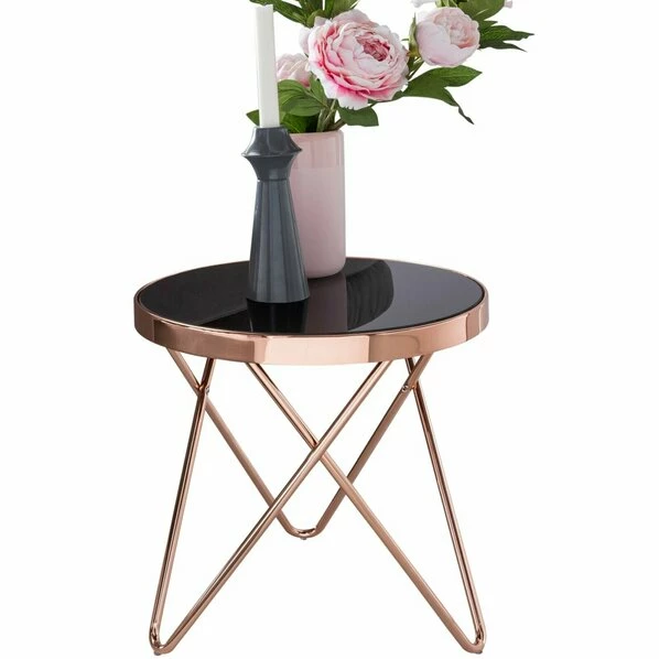 Mit seinem glänzenden kupferfarbenen Stahlgestell und dem schönen schwarzen Glas darf dieser Beistelltisch bei dir zu Hause nicht fehlen. Sein eleganter und moderner Look passt überall hin und wertet jeden Bereich auf. Dank der Anti-Rutsch-Noppen wird ein Verkratzen deines Boden verhindert.