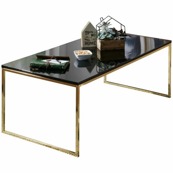 Der 120 Zentimeter breite Couchtisch setzt sich aus einer schwarzen Tischplatte und einem Metallgestell im glänzenden Gold zusammen und wird mit dieser Kombination ein charmantes Ambiente in Ihrem Wohnraum versprühen. Das besondere Etwas ist die verspeigelte Oberfläche der Platte.