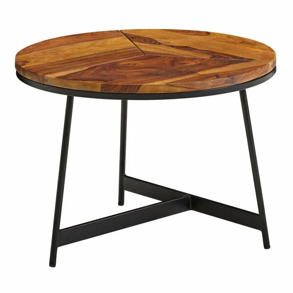 Das Motto des Couchtisches ist modern und schnörkellos. Stilprägend ist dabei vor allem die auffällig, wellig-rund gemaserte Optik. Die dunkelbraune Echtholz-Tischplatte aus Sheesham wird in drei Bereiche aufgeteilt und von einem massiven Gestell aus schwarzem Metall getragen.