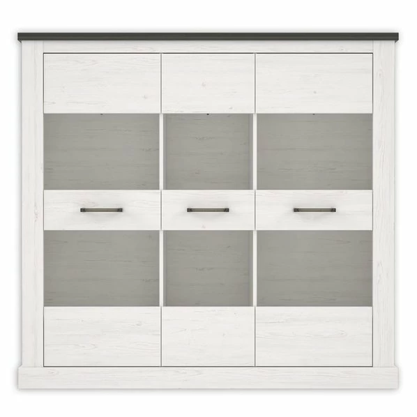 Wunderschöne Highboardvitrine im modernen Landhausstil. Der Korpus ist in Pinie weiß Nachbildung gehalten, der Absatz in Touchwood Nachbildung und die Griffe sind aus gebürstetem Metall. Hinter den drei Türen befinden sich neun Ablageböden aus Holz, die den Innenraum der Virtrine ideal aufteilen und für reichlich Stauraumfläche sorgen.