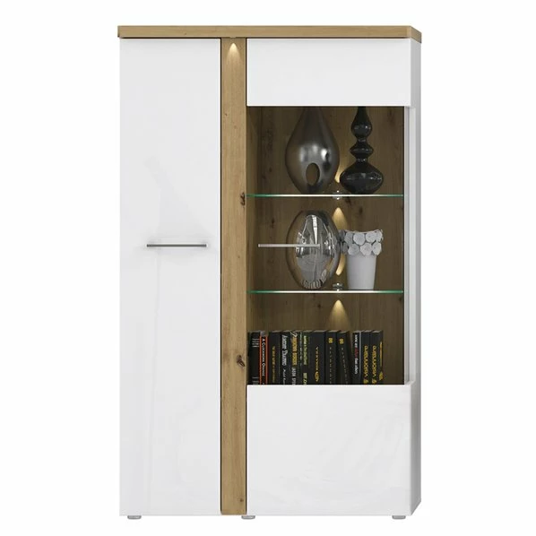 Die Highboardvitrine ist modern und elegant zugleich. Sie ist in Weiß Hochglanz gehalten und hat eine wunderschöne Absetzung in Artisan Eiche Nachbildung. Die Türen sind gedämpft und die Griffe sind chromfarben.