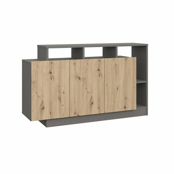 Dieses moderne Sideboard ist einfach ein richtiger Hingucker! Der Korpus in Grau wird durch die Fronten in Artisan Eiche Nachbildung perfekt ergänzt. Vier offene Fächer sorgen für ausreichend Stauraum für deine Lieblingsstücke. Weitere Gegenstände können hinter den drei Türen untergebracht werden.