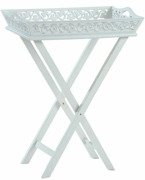 Dekoratives Tablett mit geschnitzten Ornamenten im Shabby Chic Stil auf einem praktischen Klappgestell. Beide Teile sind in der Farbe Weiß gehalten und daher vielseitig mit verschiedenen Möbeln kombinierbar. Eine tolle Abstellmöglichkeit für Snacks, Getränke oder Dekoelemente.